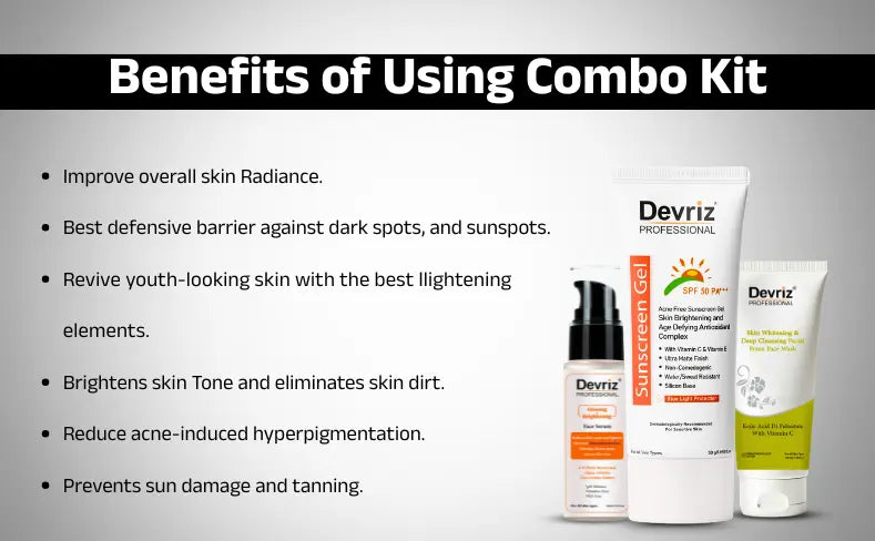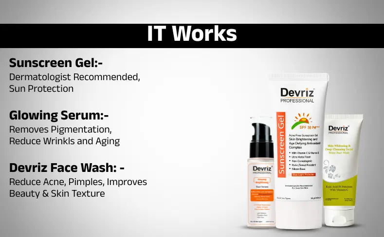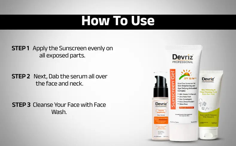 All Three Products combo are designed with the best of skin Lightening and Brightening agents. For example, you can begin your day with Face wash for deep cleansing. Followed by magical drops of skin-brightening serum for skin Glow and Sunscreen for UVA and UVB Protection. At last, you can end your day with Face wash at night to remove accumulated impurities.